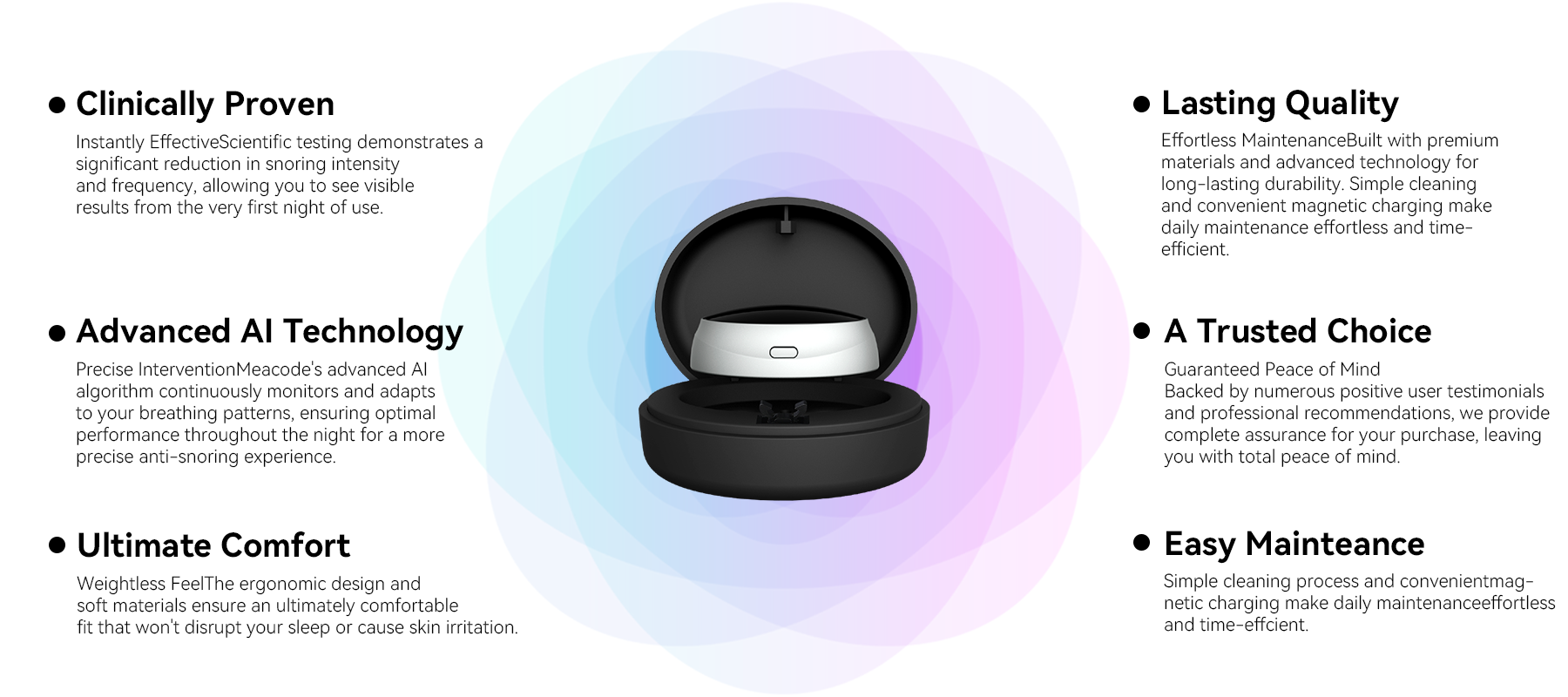 - Smart Anti-Snoring Technology: Its unique AI algorithm and dual-pulse technology precisely monitor and adjust your breathing in real time, helping you effortlessly say goodbye to snoring.