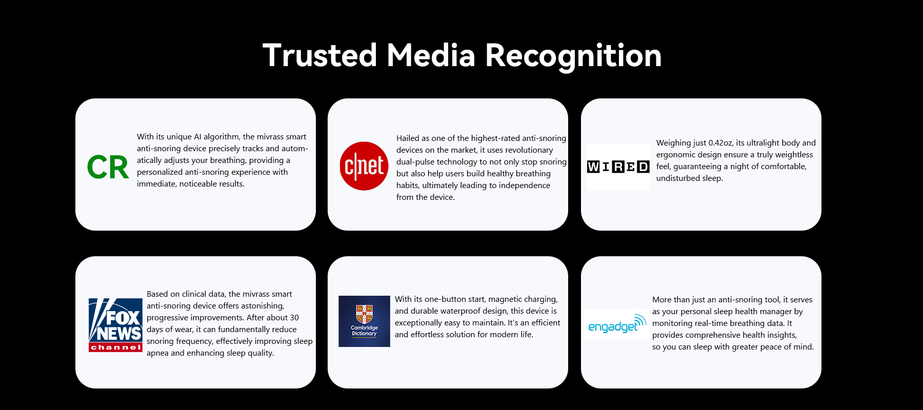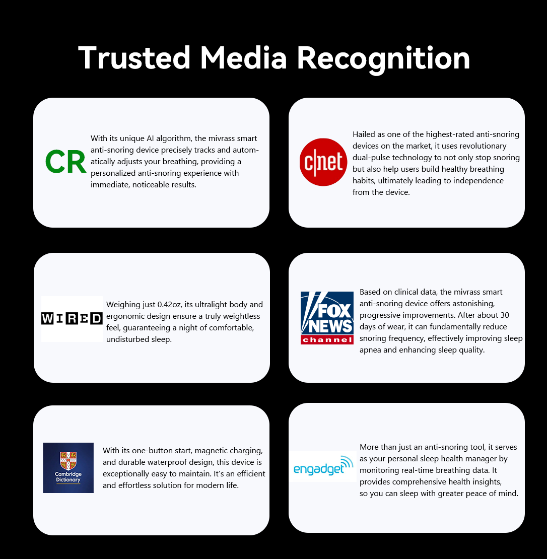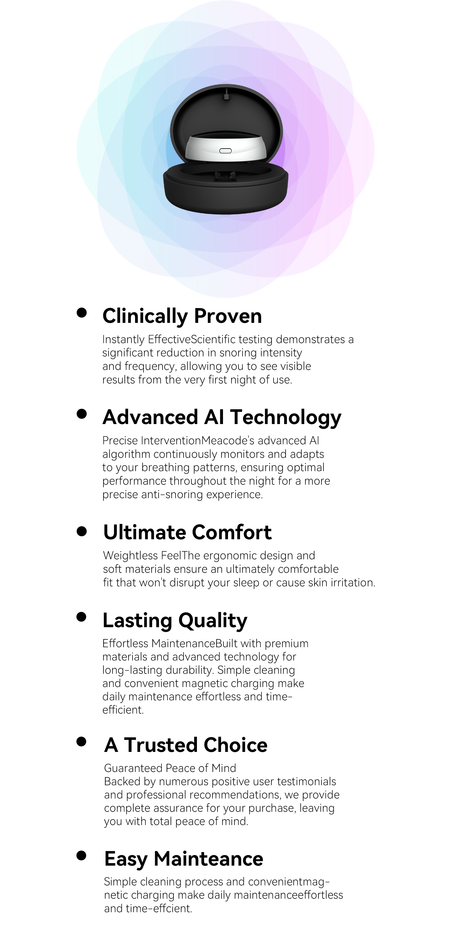 The Mivrass SilentSleep Device was the result. It uses advanced AI technology and precise dual-pulse stimulation to ensure a clear airway and sound sleep every day. Its lightweight design makes it almost imperceptible. Mivrass's core mission is to never let you down and to safeguard your health and your family's sleep.